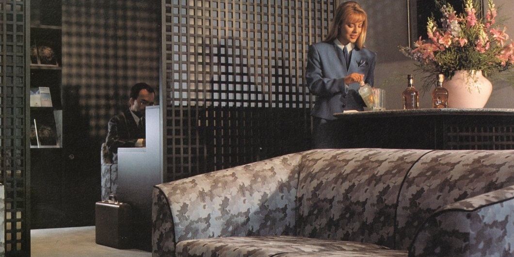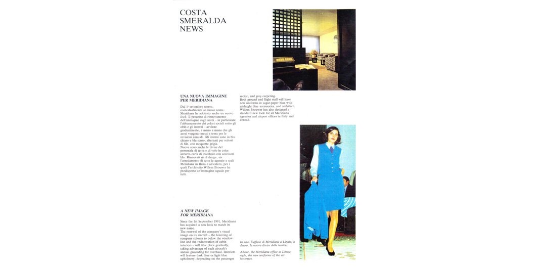 Since the 1st September 1991, Meridiana has acquired a new look to match its new name. The renewal of the company's visual image on its aircraft — the lowering of company colours to below the window-line and the redecoration of cabin interiors — will take place gradually, taking advantage of each aircraft's annual grounding for overhaul. Interiors will feature dark blue or light blue upholstery, depending on the passenger sector, and grey carpeting. Both ground and flight staff will have new uniforms in sugar-paper blue with midnight blue accessories, and architect Willem Brouwer has also designed a standard new look for all Meridiana agencies and airport offices in Italy and abroad.